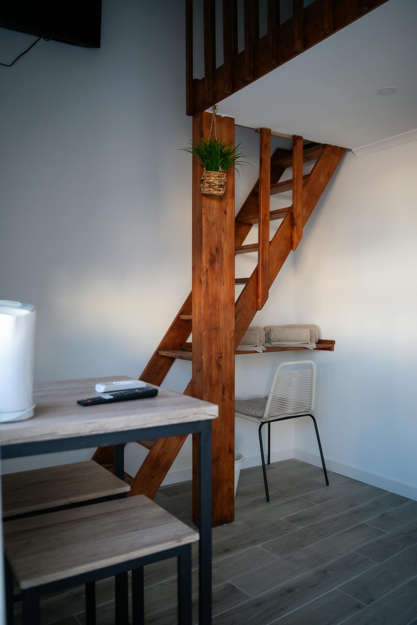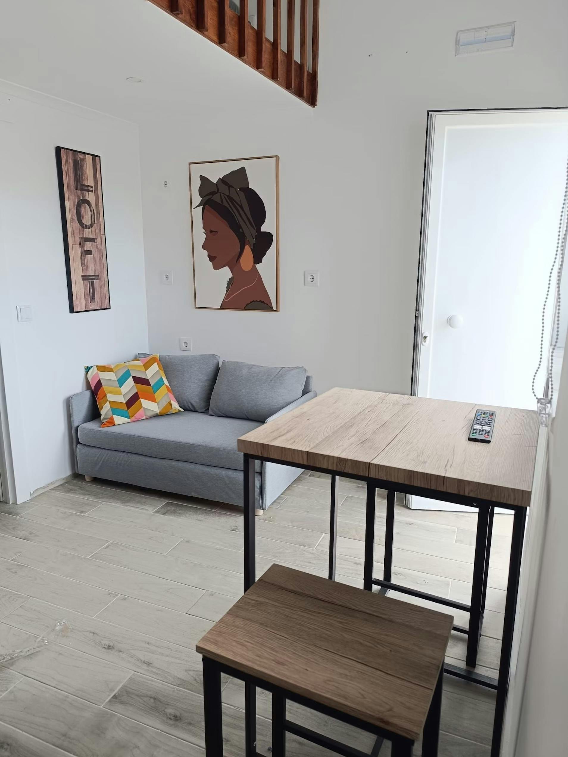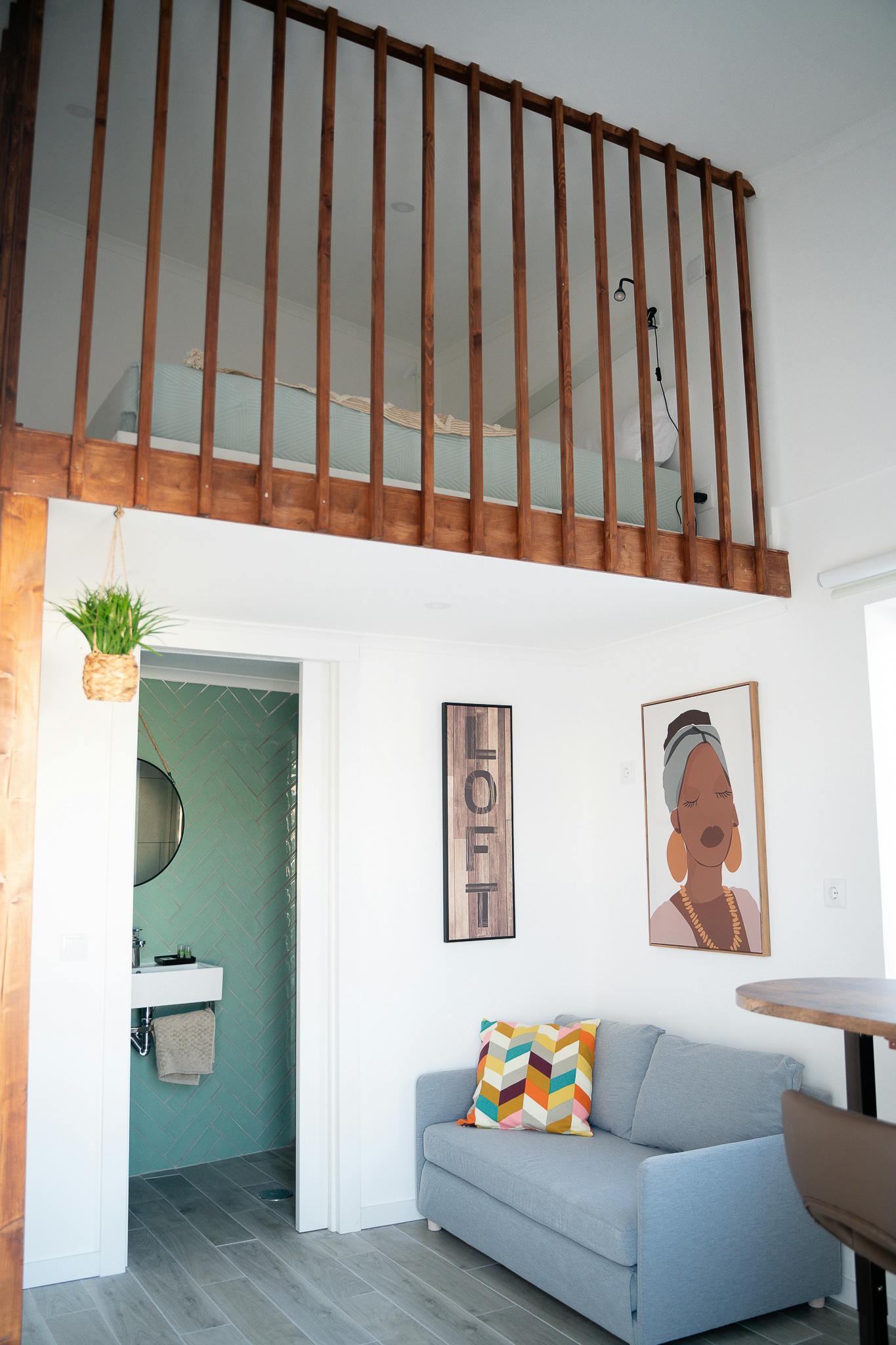 Our Lofts are a space with a double bed on an elevation accessible by stairs, a sofa bed, private bathroom, dining table and a view of the terrace.