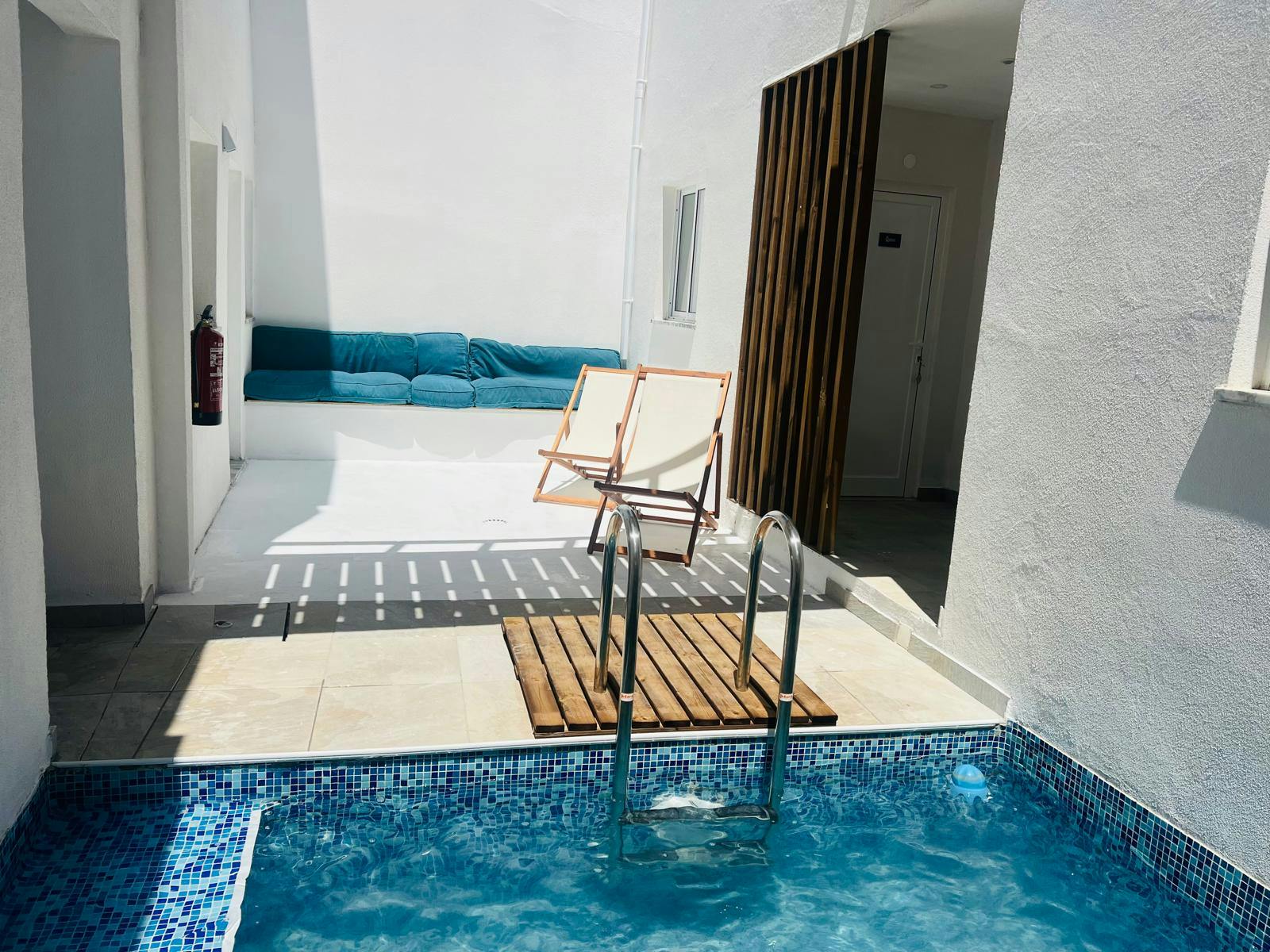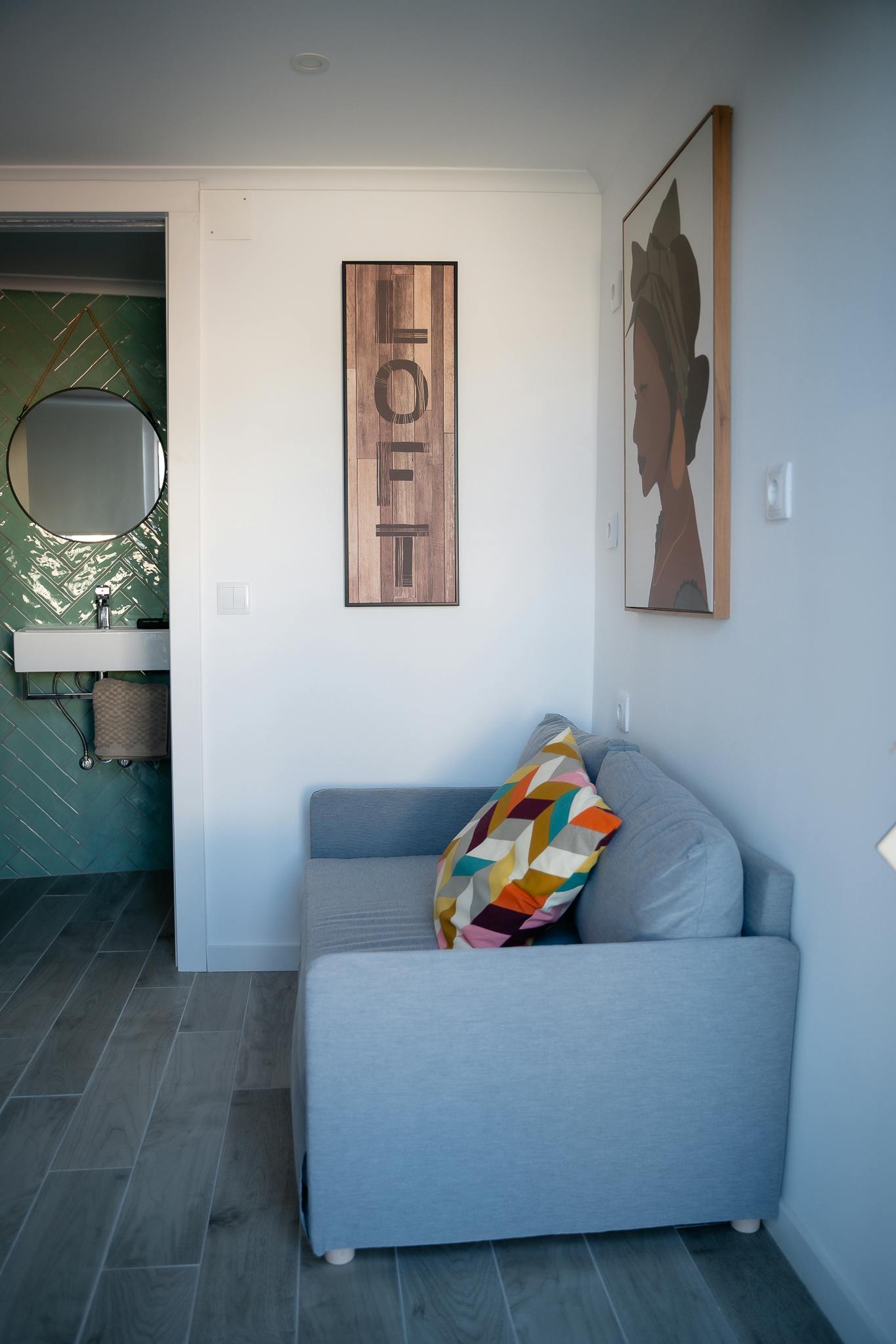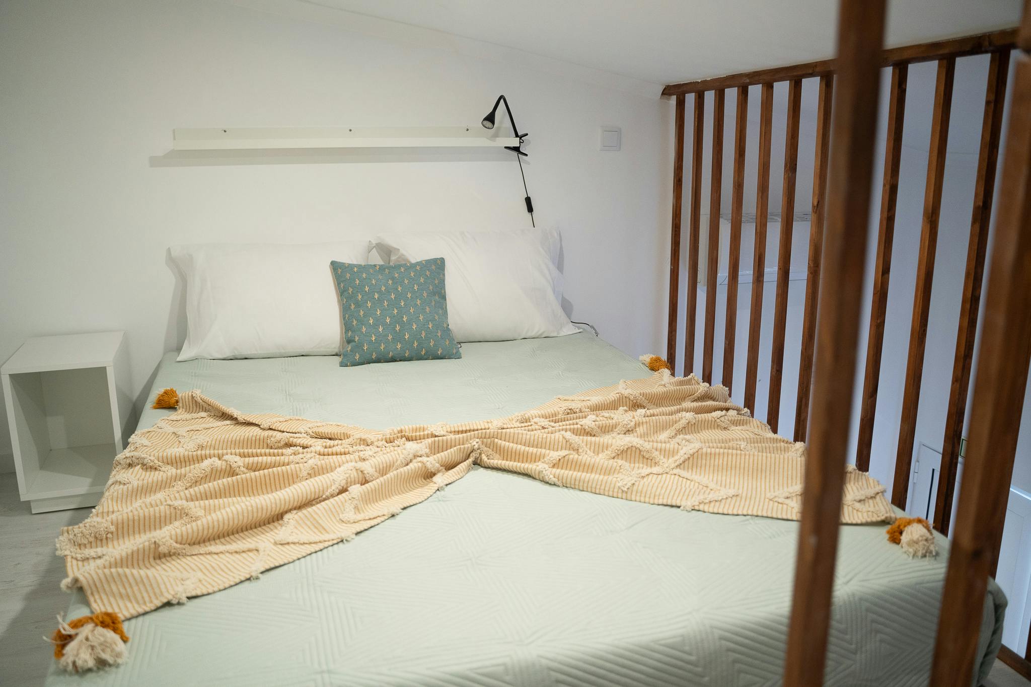 Our Lofts are a space with a double bed on an elevation accessible by stairs, a sofa bed, private bathroom, dining table and a view of the terrace.